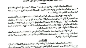 إجازة مدفوعة الأجر للعاملين في القطاع الخاص يوم الخميس القادم احتفالاً بذكرى ثورة 23 يوليو.